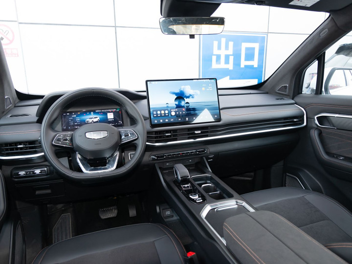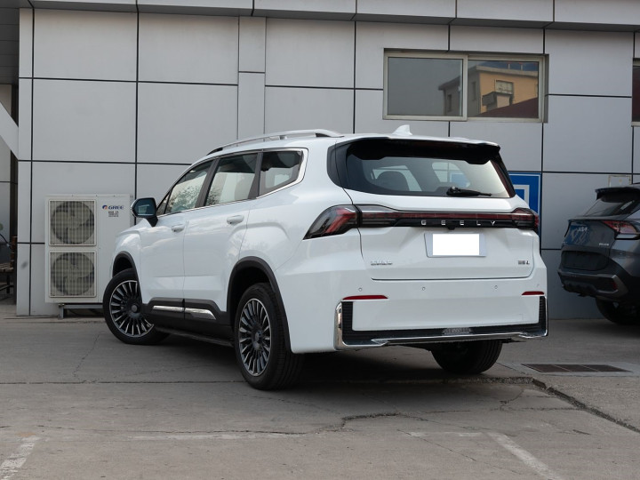再来看车尾部分,车尾设计堪称点睛之笔,“熔岩流光” 式连贯 LED 尾灯横向贯穿车尾,夜间点亮时形成完整光带,配合中央 “GEELY” 英文字标与双边共两出排气布局,科技感与力量感兼备。下包围采用黑色防刮材质,应对非铺装路面时可有效避免划痕,实用性拉满。