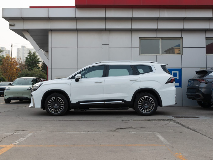 再来看车身侧面部分,车身侧面延续了豪越L的经典比例,4865mm超长车长搭配2825mm轴距,为三排座椅布局奠定基础。硬朗的双腰线设计从前翼子板贯穿至车尾,配合20英寸多辐轮毂,既强化了力量感,又避免了臃肿感。车顶行李架为全系标配,配合可开启全景天窗,满足家庭露营等户外场景需求;车门下方的镀铬饰条与防刮踏板组合,既提升精致度又方便老人小孩上下车。而4900×1910×1770mm 的三维尺寸与 2825mm 轴距,使其同价位车型中表现出色。
